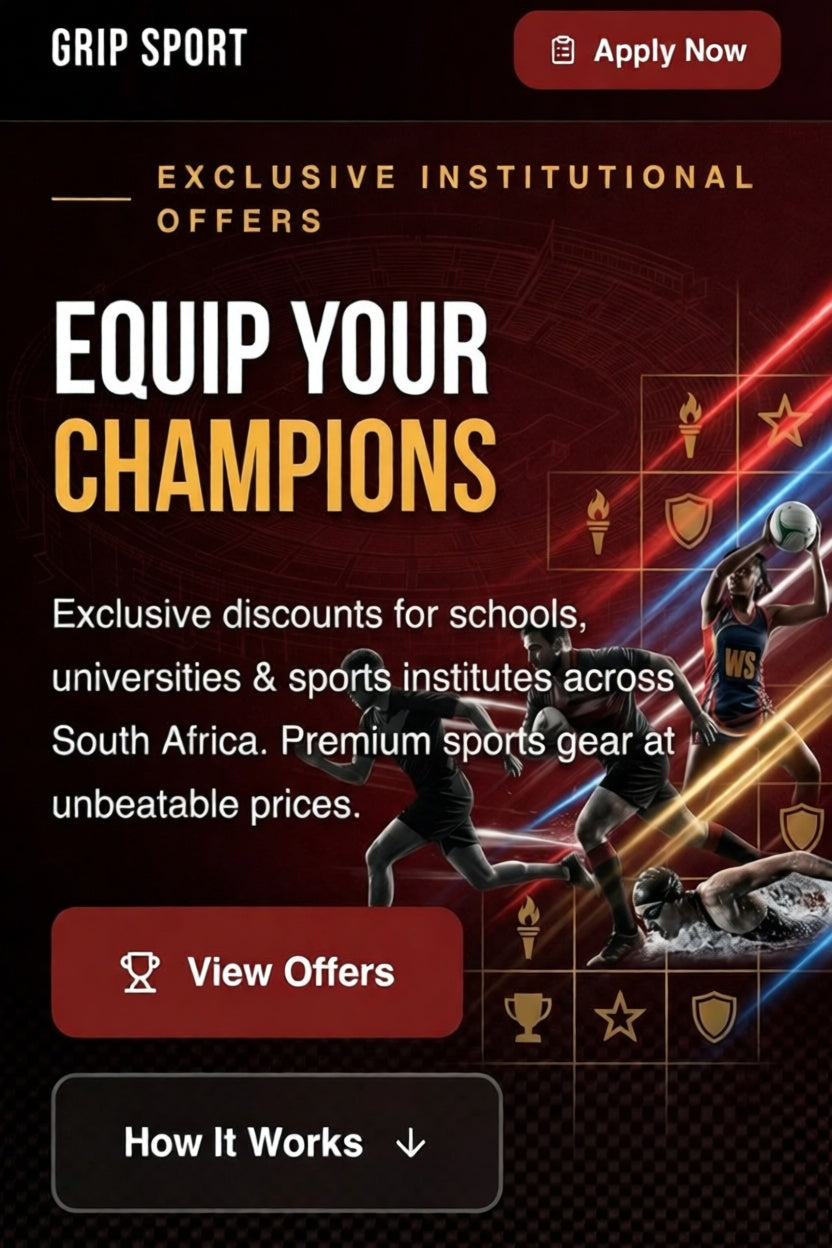 Rolly Rocker Soccer Kit Premium Combo” by Grip Sport. It shows multiple colorful soccer jerseys and shorts. The offer includes 14 tops and 14 shorts, plus free items: jersey number print, GK gloves, kit bag, socks, GK kit, delivery, whistle, Molten ball, captain’s armband, and pump. Text notes delivery anywhere in South Africa with no weight restrictions.
